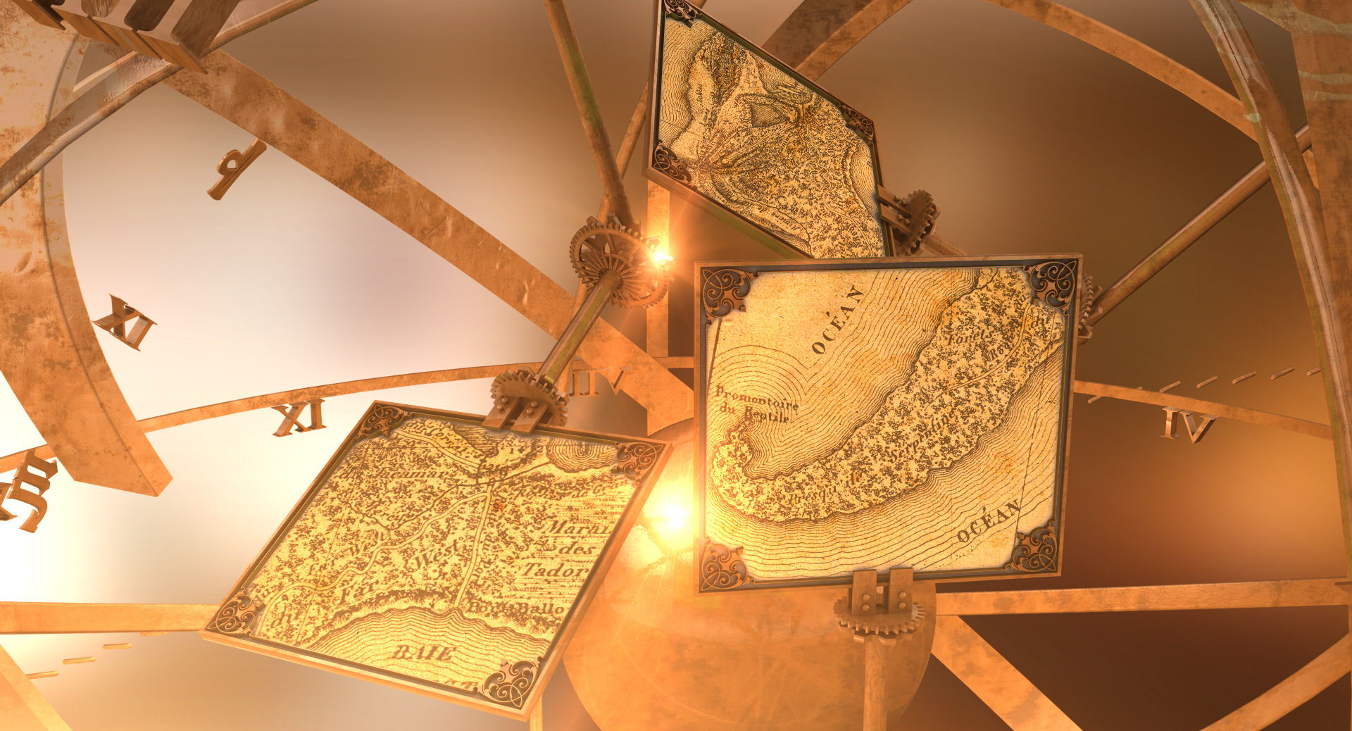 The machine, a sort of compass, gyroscope and magical gadget was designed as a way to showcase the titles as well as the vast artwork and mysteries of the movie.